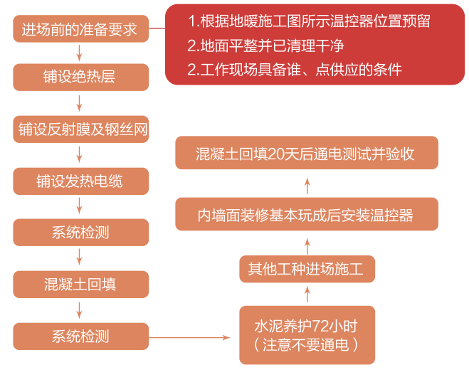 地暖進(jìn)場(chǎng)前的要求(裝潢公司的冷熱水、強(qiáng)弱電必須完全結(jié)束并通過(guò)業(yè)主的驗(yàn)收,衛(wèi)生間防水要刷好,地面平整度需要按要求做好,線管如何走等);在現(xiàn)場(chǎng)大家可一起溝通一下施工的進(jìn)度,地暖的進(jìn)度是按照裝潢的節(jié)點(diǎn)來(lái)的,裝潢做好一步,地暖才可以跟進(jìn)一步,是無(wú)法確定具體時(shí)間的,基本上是裝潢的一步做好了,再提前幾天通知暖通公司做下一步,但是交底時(shí)暖通公司需要把各個(gè)