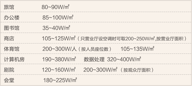 根據(jù)國(guó)內(nèi)現(xiàn)有的一些工程冷負(fù)荷指標(biāo)套用(下列指標(biāo)為按總建筑面積的冷負(fù)荷指標(biāo)):